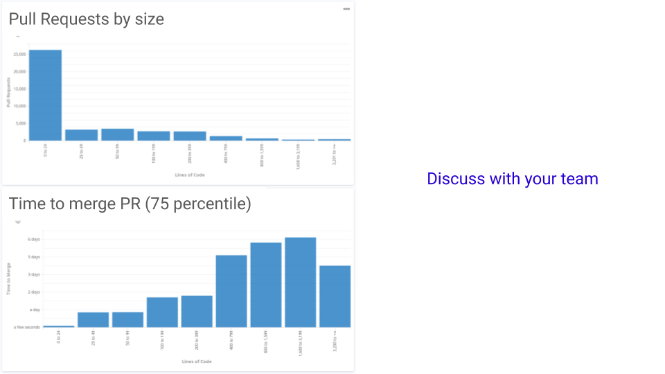 很明显,小型 PR 合并得更快。实际上,只不过几十行的大小差异就能让合并时间从几小时增长到几天。
