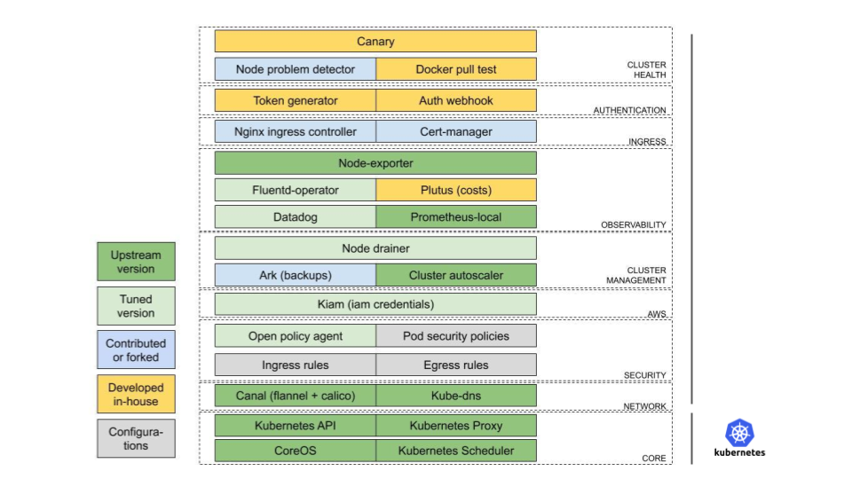 以下是 Kubernetes 原始安装提供的内容和我们集群提供内容的简化对比。