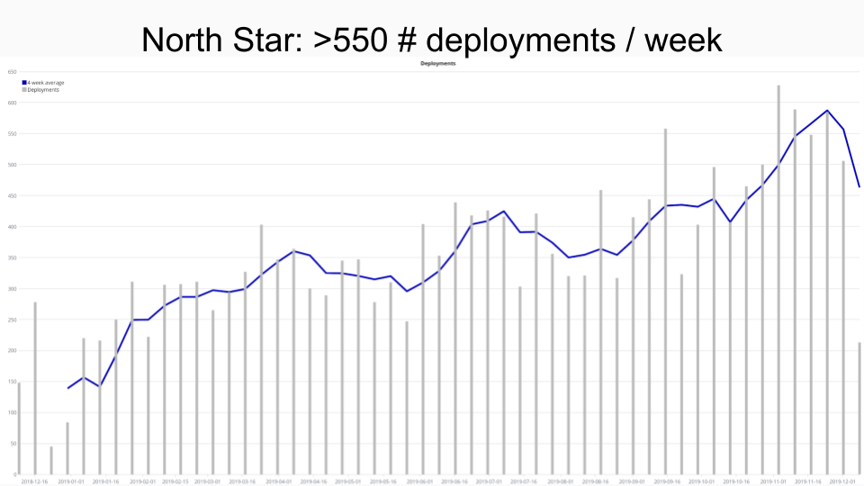 如上所述,类似 Accelerate 提出的那类指标应该是很有用的,因为它们可以精确衡量我们希望改进的属性。在获得专业产品管理顾问 Itamar Gilad 的帮助后,我们设置了每周成功部署这个指标作为我们的北极星。