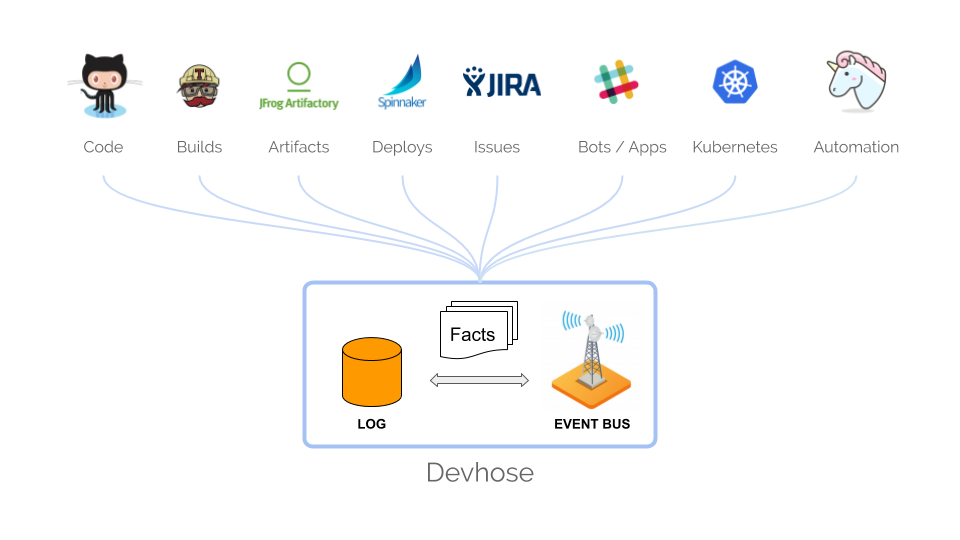 因为没花太多时间来构建核心工具,所以我们可以专注于胶水(the glue)。上面的幻灯片展示了 Devhose,它是一个组件,可从我们开发生态系统中的每个工具收集事件,将其存储在日志中,并在一个“工程事件总线”中广播出去。
