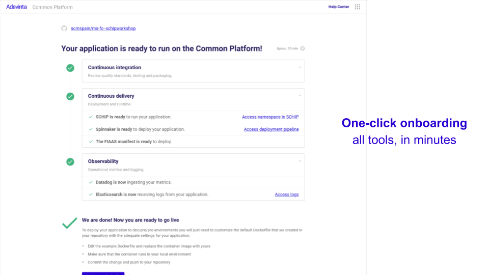 他们存储库只需约 10 分钟的时间就能自动配置好 CI/CD 管道,然后部署到他们团队的私有命名空间上,并与指标和日志系统集成就绪。