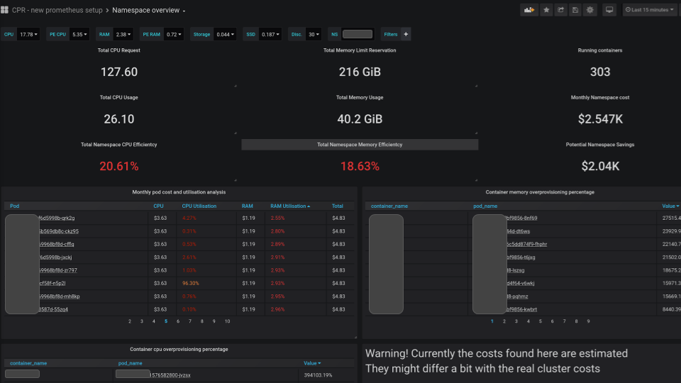 并且我们能深入探索你的成本节省空间(直至 pod 级别),并在用户过度配置时通知他们潜在的节省空间。下面是带有这些信息的一个 Grafana 仪表板的 PoC: