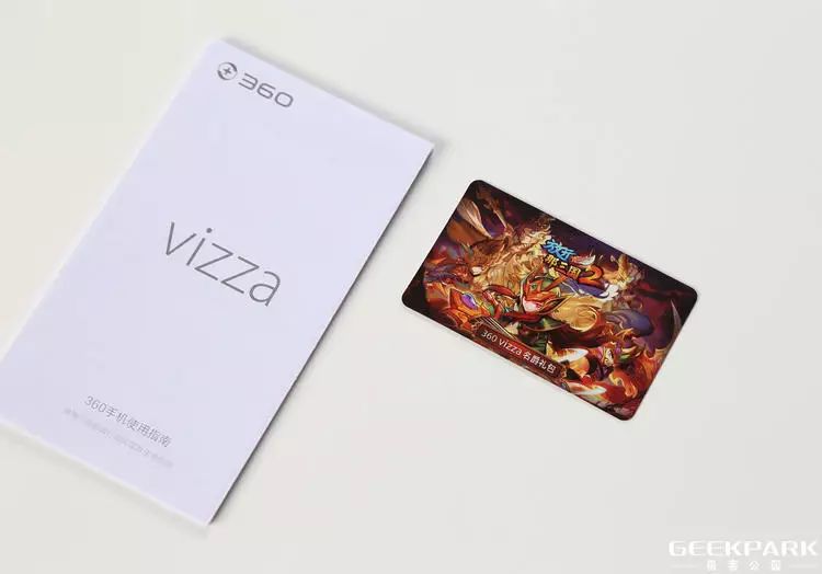 由于这次 360 vizza 与手游《放开那三国 2》进行合作(送价值 999 元名爵礼包),在它的包装清单中,除了 360 手机 vizza、电源适配器、USB 数据线、SIM 卡卡针、说明书这些常规的配件,还有一张相应的卡片。