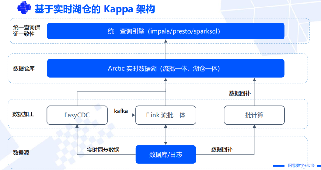 综上,网易集团内部主要进行 Lambda 架构的改造,而针对企业客户,主要的实践是 Kappa 架构。网易集团内部的互联网业务和传统企业客户的业务,数据处理的场景和方式不一样,不过两者没有绝对的界限,网易集团内部也有一些潜在的使用 Kappa 架构的场景,比如严选电商就有很多实时数据来自数据库的场景。