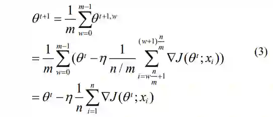 假设某分布式机器学习系统共有 m 个计算节 点,批尺寸为 n。当采用数据并行时,每个计算 节点每轮处理的样本数量为 n/m。各计算节点基 于所分配到的训练数据对模型进行更新,然后将 不同计算节点更新后的模型进行汇总。汇总后的 模型参数如下: