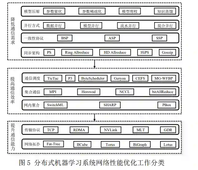 1) 降低通信需求。通信需求,即需要通信 的数据量和通信次数,对通信耗时具有根本性的 影响。显然,数据量越大,或者通信越频繁,通 信耗时越长。因此,为了减少通信耗时,可以从 机器学习算法层面构建低网络通信需求的训练模 型,或采用知识蒸馏和模型剪枝等方式对原模型 进行修改以减小模型尺寸。这些方法会造成训练 模型的变化,超出了本文的讨论范围,故后文不 再作详细描述。参数量化以及参数稀疏化保持训 练模型不变,通过降低被传输的参数量来降低通 信需求。并行方式的优化通过权衡参数数据量和 激活值数据量的大小来切换不同的并行方式:当 参数数据量较少时,采用数据并行;反之,采用 模型并行。模型一致性协议通过控制参数同步的 频率来调节通信需求。参数同步架构对通信次数 和每次通信的数据量均会产生影响,通过选取合 适的参数同步架构可以有效降低通信需求;