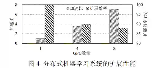 对比公式(2)和公式(3)可知,如果在每一轮训 练结束时,将模型参数在所有计算节点间进行同 步,则分布式训练时的模型参数变化和单机训练 完全相同,即分布式训练可以在不改变模型的收 敛性的前提下提高模型的收敛速度。需要说明的 是,在实际应用中,一般是对不同计算节点的梯 度进行汇总,然后使用汇总后的梯度来更新模型 参数,并将新的参数赋给各计算节点的模型副本。相比于单机训练,分布式训练额外引入了节 点之间的数据通信,从而导致分布式训练的速度 无法随着计算节点数量的增加而线性提高。衡量分布式机器学习训练加速效果的指标主要包括加 速比(speedup)和扩展效率(scaling efficiency)。加速比是指同一机器学习训练任务在单机训练和 分布式训练时所需时间的比值。加速比越大,分 布式训练的加速效果越显著,也就是说,可以更 快地完成训练任务。需要注意的是,加速比有可 能出现小于 1 的情况,此时分布式训练速度反而 不及单机训练。扩展效率是指加速比和计算节点 数量的比值。扩展效率越高,各计算节点的计算 资源利用率也就越高。图 4 展示了利用 Nvidia Tesla V100 GPU 训练 BERT 模型时加速比和扩展 效率随 GPU 数量的变化,可以看出加速比和扩展 效率的变化趋势并不相同。一般来说,随着节点 数量的增多,扩展效率呈下降趋势,而加速比则 呈先升后降趋势。加速比在节点数量增多时反而 下降,是由于参数同步引入的通信开销抵消了新 增节点带来的性能收益。