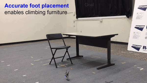 机器人要跳到椅子上,不能掉下来,起跳点就非常关键;跳到椅子上之后还要调整位置,到达下一个起跳点,再跳上桌子。