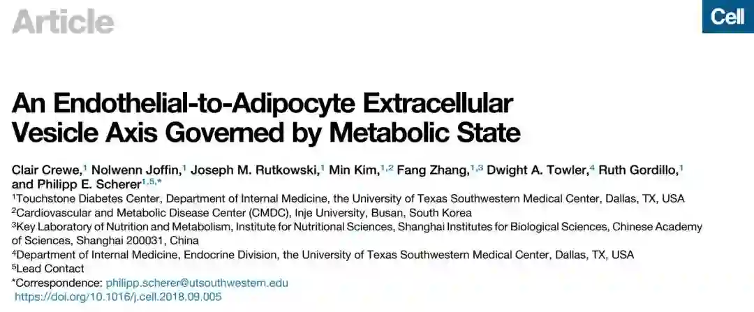 Crewe C,Joffin N, Rutkowski JM, Kim M, Zhang F, Towler DA, Gordillo R, Scherer PE. An Endothelial-to-Adipocyte Extracellular Vesicle Axis Governed by Metabolic State. Cell. 2018 Oct 3. pii: S0092-8674(18)31177-2. doi:10.1016/j.cell.2018.09.005. [Epub ahead of print]