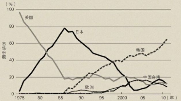 日本半导体芯片产业份额就此滑落,从1986年的40%,一路跌跌不休到2011年的15%。其中DRAM存储芯片受打击最大,从高点的80%全球份额一路下滑到10%,回吐了70%。