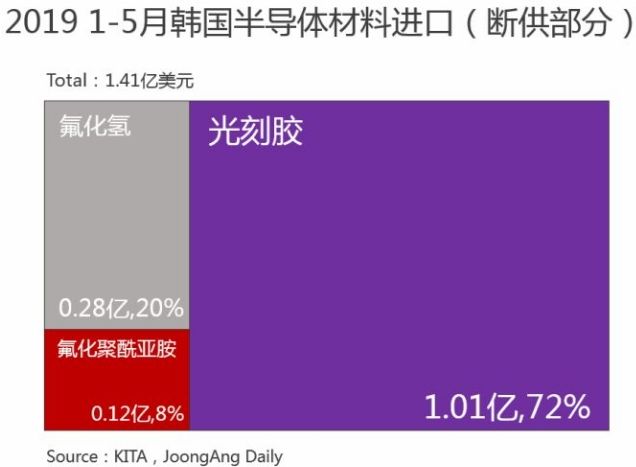 根据韩国贸易协会数据,今年日本断供韩国的材料只有1.41亿美元,其中72%是光刻胶,这和韩国2018年出口的392亿美元的半导体相比微不足道,但是没这些材料就是啥都生产不出来。