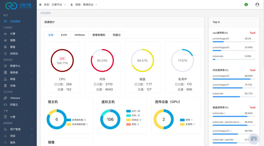 “云联万维”能够在统一多云管理平台OneClond上对企业各种IT资源自动化管理,包括物理机、虚拟化平台、私有云、公有云和容器等。