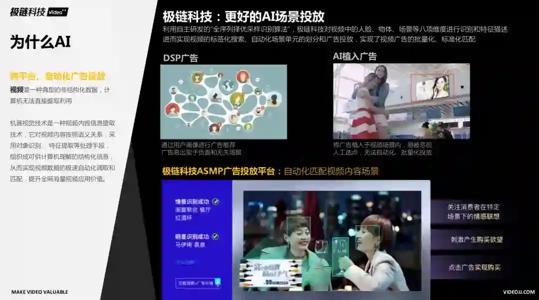 因此,极链科技利用AI技术,可以将中长尾流量通过场景匹配的方式,把它解析成为可以直接被广告主投放的一些要素,比如说聚会、情感单元、明星等场景,当把它解析完了以后,可以一次性匹配到几百部剧,从而达到聚沙成塔的自动化投放效果。
