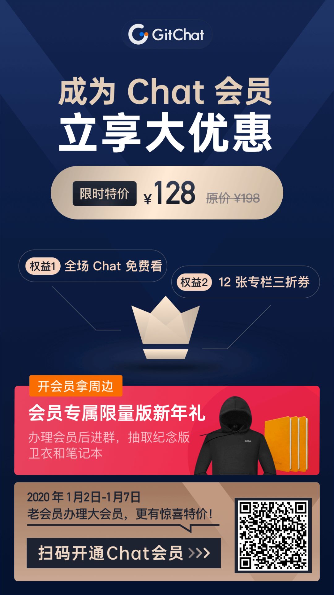 无论你现在是 Chat 会员、超级会员、精英会员,还是你曾经是任何一种 GitChat 会员,在 2020 年 1 月 2 日到 2020 年 1 月 7 日期间,你都可以用超值的续费价格成为 GitChat 大会员,享受大会员特权。