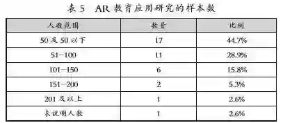 关于AR教育应用研究的参与实验的样本数量结果见表5。结果表明,有一半的研究采用中等研究样本,即“51和200之间”(50%),还有近一半的研究样本数量在“50人及以下”(44.7%)。在此次研究的论文中,仅有1例研究的样本数量为292人(“201及以上”)(2.6%),那个样本来自在科技馆用AR进行非正式教学的研究。AR教育应用研究样本数量集中在200人以下的可能原因有:首先,早期进行的AR教育应用的研究大部分属于试点研究,主要考察AR教育应用的可行性,这类研究一般在小范围内进行,所以样本数目比较小;其次,由于AR教育应用研究的所有参与实验者都需要有一套设备(手机、PC、摄像头及其他的实验材料),大的研究样本需要的设备数量多、成本较高。