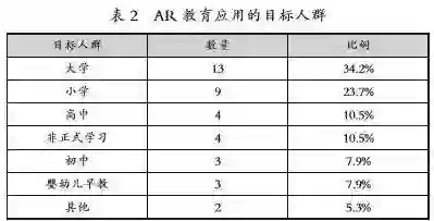 目标人群指的是在AR教育应用实验研究中参加者的学段层次,结果如表2所示。