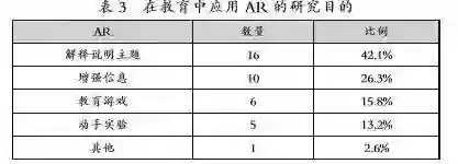 从表3中可以看出,大多数的AR教育应用是为了解释说明主题(42.1%)与増强信息(26.3%)。解释说明主题指的是使用AR技术帮助学习某问题或概念;而増强信息指AR通过标记或位置给学习者提供相应的数字辅助信息。