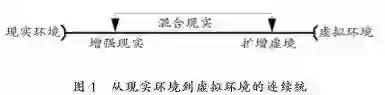 增强现实(AR)技术是一个比较宽泛的概念,不同行业背景的人对其有不同的定义。米尔格拉姆[9]提出了一个现实环境与虚拟环境的连续统,(AR)在这个连续统中的位置如图1所示。一般人认为,“任何在特定位置结合现实与虚拟的技术”都可称为增强现实(AR)技术,其中现实物体与虚拟信息都起非常重要的作用[10];计算机软件设计、开发的从业人员认为,AR技术是“以计算机技术为核心,综合使用各种新技术,融视、听、触觉为一体的模仿现实的三维空间再现的技术”,它涉及计算机图形学、人机交互技术、模式识别、传感技术、人工智能等领域[11];而教育相关的从业人员认为,AR技术是指“给三维空间或现实的物理世界叠加一层计算机辅助数据信息而产生一个新的世界的技术”,有时称为“混合现实”。AR技术给现实世界增加了一层虚拟信息,因此,它给教育带来新的机会[12]。