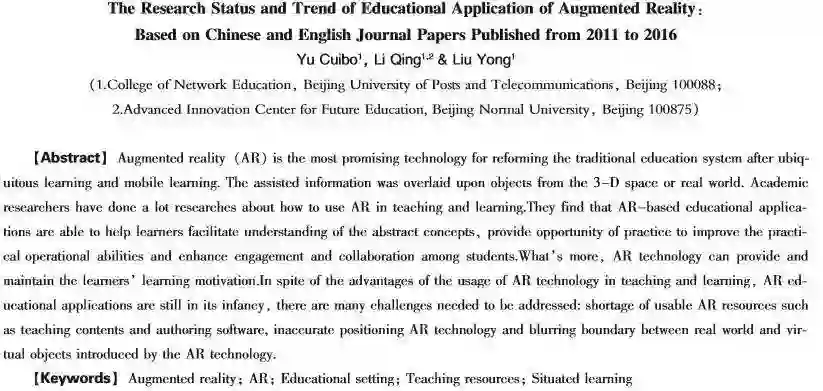 关键词:增强现实;AR;教学环境;教学资源;情景化学习