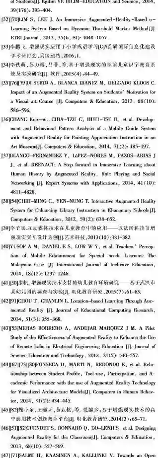 由于AR系统内容的多种媒体表达方式,打破传统文字信息的单调性,能够适应不同学生不同学习方式的需要。因此,多数研究结果都证明,AR系统能够更好的支持学习[76-78],激励学生参与的积极性。因为应用AR,学生以更少的认知付出却得到更好的学习效果[79]:短时间内成绩明显提升[80],协助实地探究,提升了满意度与学习注意力[81],提高了学习兴趣[82]。