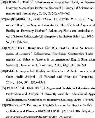 AR本身是一个正在发展中的技术,AR在教育中的尝试应用研究也正在不断进行中,已有的AR在教育中应用研究及文献说明,AR对教育的各方面都有良好的影响。但不容否认,也有一些研究发现,教育中应用AR存在着不足或问题等。