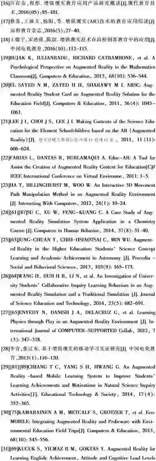AR在其他领域的成功应用,促使人们期待将其应用到教育教学中的效果。于是,研究人员分别就AR技术应用于自然科学、医药、工程学、语言、历史、艺术等众多学科,在幼儿园、小学、中学、大学、实验室、博物馆、公园、动物园等不同的教学与学习环境分别进行了若干实验研究。