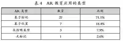 教育应用AR的类型研究结果见表4。陈智明等将AR技术分为三类:分别是基于标记AR、无标记AR与基于位置的AR[54]。基于标记AR是使用人工生成的标记或标签进行目标识别,标记或标签包括彩色或黑白矩阵式二维条形码(QR)、AR标记、射频标签(RFID)或其他人工生成的标签。无标记的AR系统是使用目标物体真实的自然特征来识别目标,可识别目标的特征有图书封面、海报、地标或其他的标志特征,不使用任何人工生成的标记。而基于位置的AR系统,根据设备地理位置传感器获取的地理位置信息来跟踪目标,可用的地理位置信息获取装置有GPS、数字罗盘、加速计等。