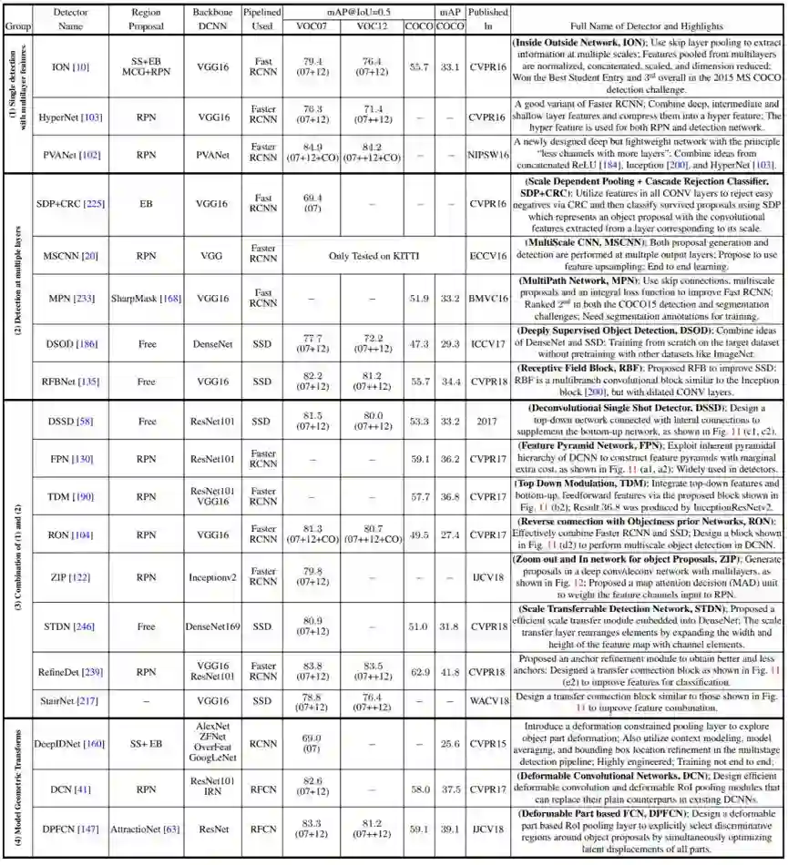 表 3:在改进用于一般目标检测的 DCNN 特征表示中的表征方法的特性总结。详细讨论参见 4.1.2 节。缩写:Selective Search(SS)、EdgeBoxes(EB)、InceptionResNet(IRN)。mAP@IoU=0.5 时,在 VOC07、VOC12 和 COCO 上报告的检测结果;另一列在 COCO 上的结果是在一个新指标 mAP@IoU=[0.5 : 0.05 : 0.95] 上报告的,这是在从 0.5 到 0.95(写成 [0.5:0.95])的不同 IoU 阈值上平均求取 mAP。训练数据:07 表示 VOC2007 trainval,12 表示 VOC2012 trainval,07+12 表示 VOC07 和 VOC12 trainval 的并集,07++12 表示 VOC07 trainval、VOC07 test 和 VOC12 trainval 的并集,07++12+CO 表示 VOC07 trainval、VOC07 test、VOC12 trainval 和 COCO trainval 的并集。COCO 检测结果是在 COCO2015 Test-Dev 上报告的,只有 MPN [233] 除外,其结果基于 COCO2015 Test-Standard。