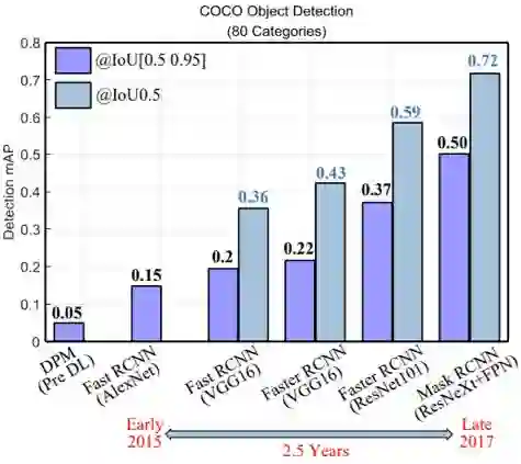 一般目标检测问题本身的定义为:给定任意一张图像,确定其中是否存在任何预定义类别的形义目标实例;如果存在,就返回其空间位置和覆盖范围。目标(object,也可译为「对象」或「物体」)是指可以被看见和触碰的有形事物。尽管一般目标检测和目标类别检测有很多共同的含义,但前者更注重旨在检测种类广泛的自然事物类别的方法,而后者则主要针对特定目标实例或特定类别(比如人脸、行人或车)。一般目标检测已经得到了很大的关注,我们也能从近些年的目标识别竞赛上看出这一点,比如 2006-2012 年的 PASCAL VOC 检测挑战赛 [53, 54],2013 年的 ILSVRC 大规模检测挑战赛 [179] 以及自 2015 年以来的 MS COCO 大规模检测挑战赛 [129]。图 1 展示了近些年目标检测方面的引人注目的进展。