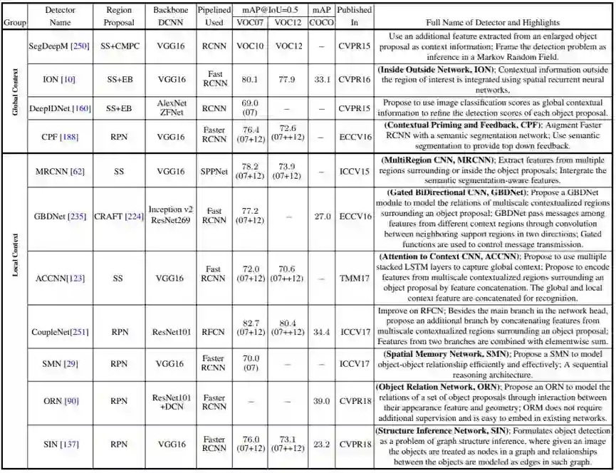 这一节将描述重要的子问题,包括特征表示、区域提议、形境信息挖掘和训练策略。每种方法都会通过其主要贡献进行回顾。