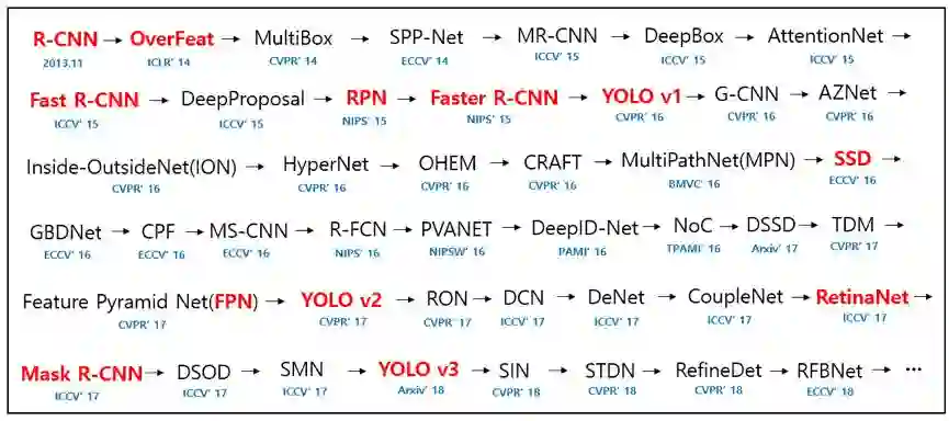 此外,来自首尔国立大学的 Lee hoseong 在近期开源了「deep learning object detection」GitHub 项目,正是参考该论文开发的。该项目集合了从 2013 年 11 月提出的 R-CNN 至在近期举办的 ECCV2018 上发表的 RFBNet 等四十多篇关于目标检测的论文,相当全面。这些论文很多都曾发表在机器学习或人工智能顶会上,如 ICLR、NIPS、CVPR、ICCV、ECCV 等。正如图中红色字体标示的那样,其中也包含了很多代表性的成果,如从 R-CNN 到 Mask R-CNN 的 R-CNN 系列、YOLO 系列、RPN、SSD、FPN 以及 RetinaNet 等。无论对刚入门的机器学习新手,还是想深入研究目标检测的研究者,都是难得的学习、参考资源。