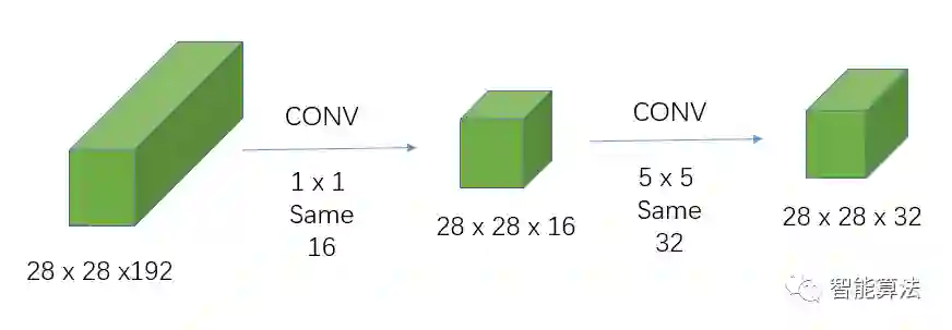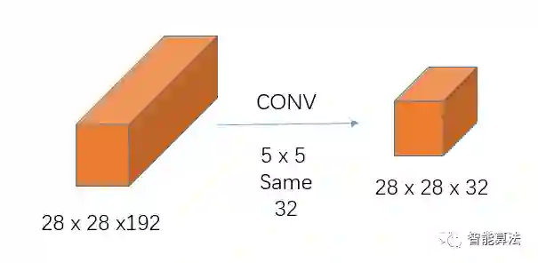 增加非线性好理解,通过控制卷积核的数量来达到通道数的缩放也好理解,那么怎么减少计算量和减少参数呢?我们从一个实例来看:假如前一层输入大小为28 x 28 x 192,输出大小为28 x 28 x 32,如下: