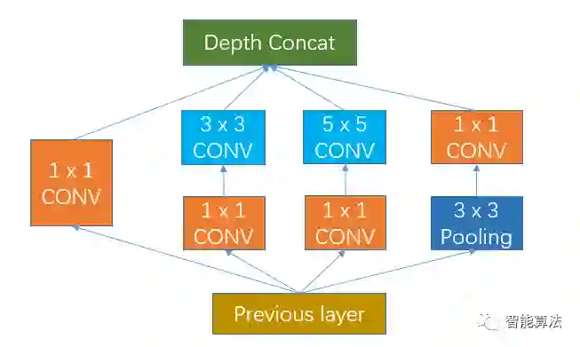 Inception的初始版本就是没有加入1x1卷积的网络,如下图: