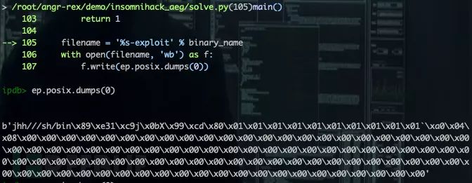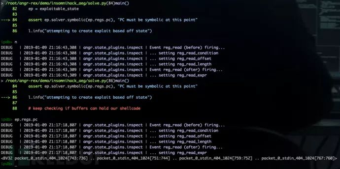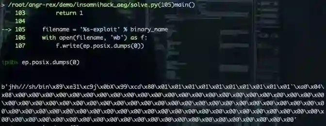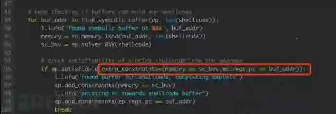 通过 ep.satisfiable() 对约束条件 extraconstraints=(memory == scbvv,ep.regs.pc == buf_addr) 的可解性进行判断。最终判定为约束可解,并生成 Exploit: