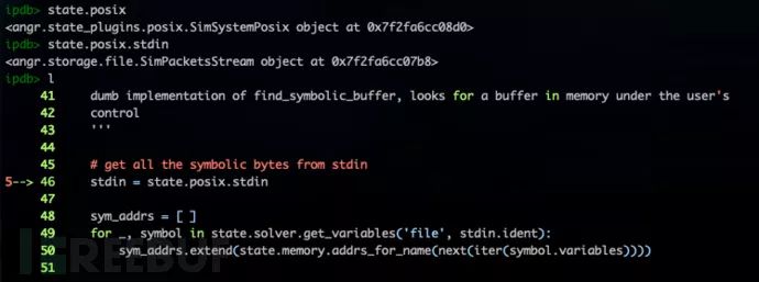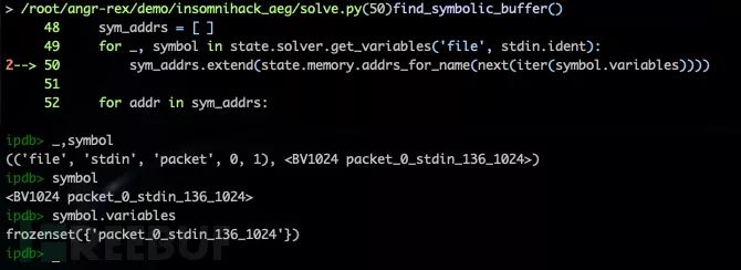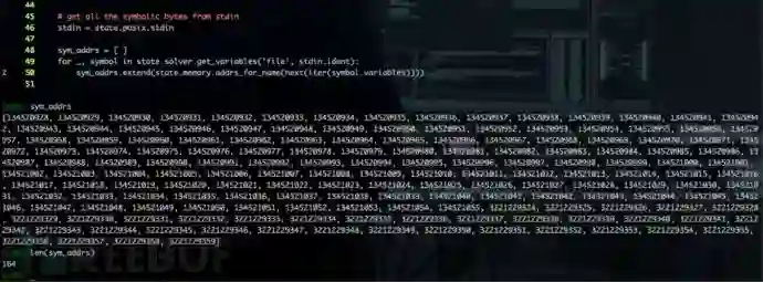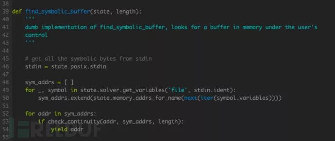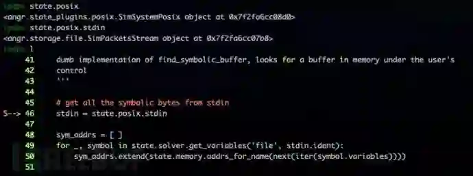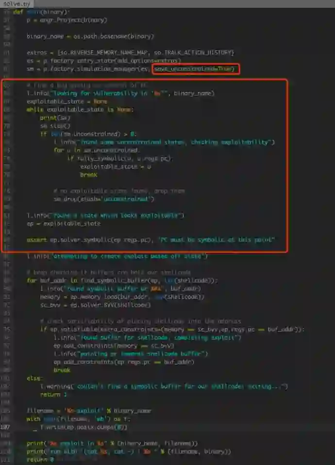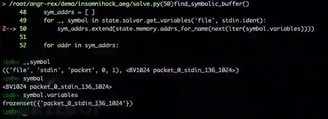 在触发控制流劫持后,需要分析当前状态下内存中符号变量的分布情况。solve.py 中的 findsymbolicbuffer() 实现相关功能,主要包括查找符号输入、追踪符号变量两个部分。