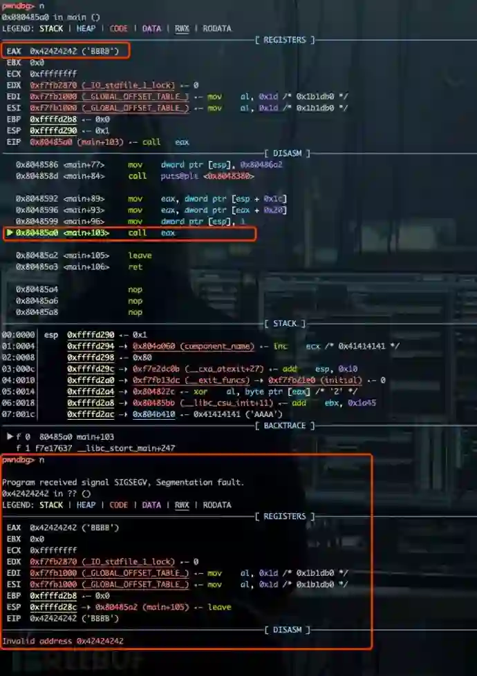 当程序执行至 cmp->do_something(1) 时触发 Segmentation fault,此时 EIP 为 “\x42\x42\x42\x42”,表明程序的控制流已被劫持。