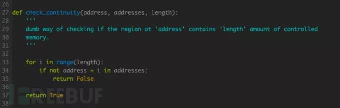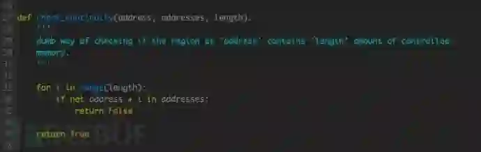 本例中,Exploit 方式采用 ret2text 且不考虑安全机制,因此仅需找到一片足以放置 shellcode 的连续空间即可。检查空间连续性的函数如下: