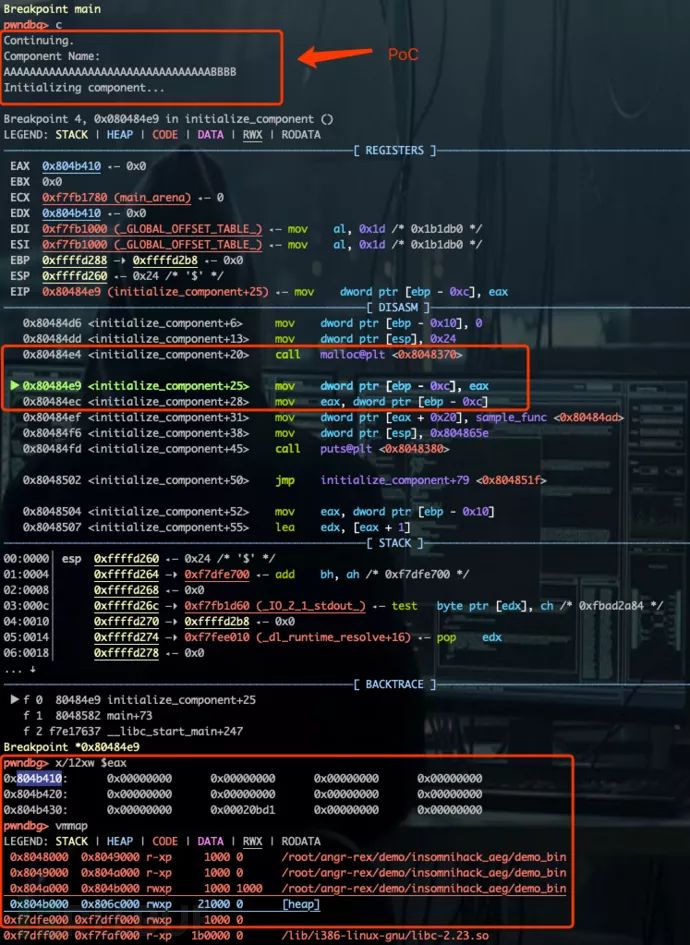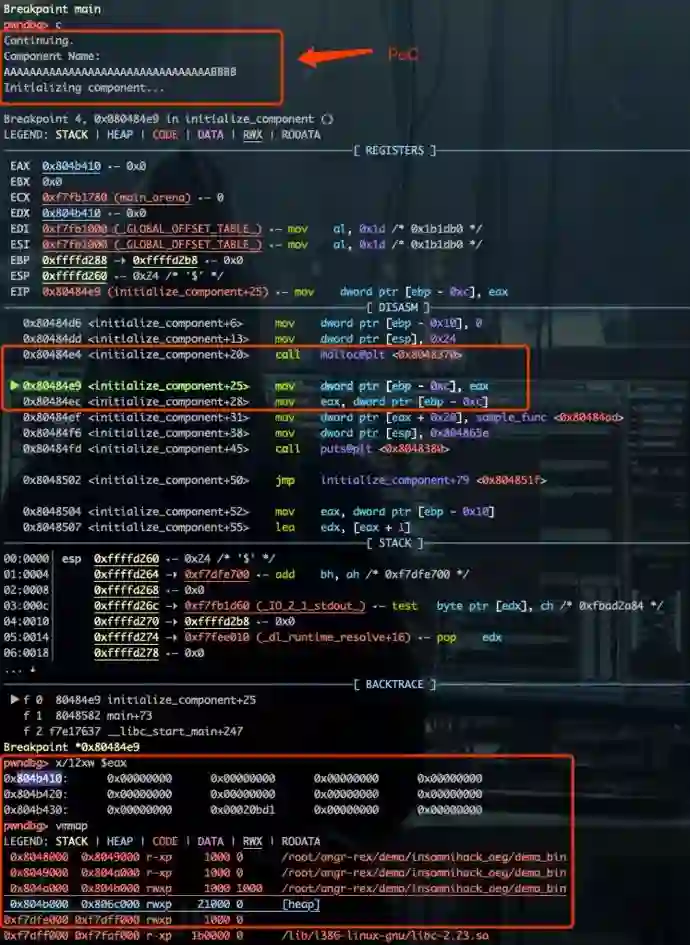 利用 GDB 加载 demobin 并输入 PoC,在 initializacomponent( char *cmp_naem) 函数中,调用 malloc() 之后设置断点。查看此时 malloc() 所分配的内存情况。