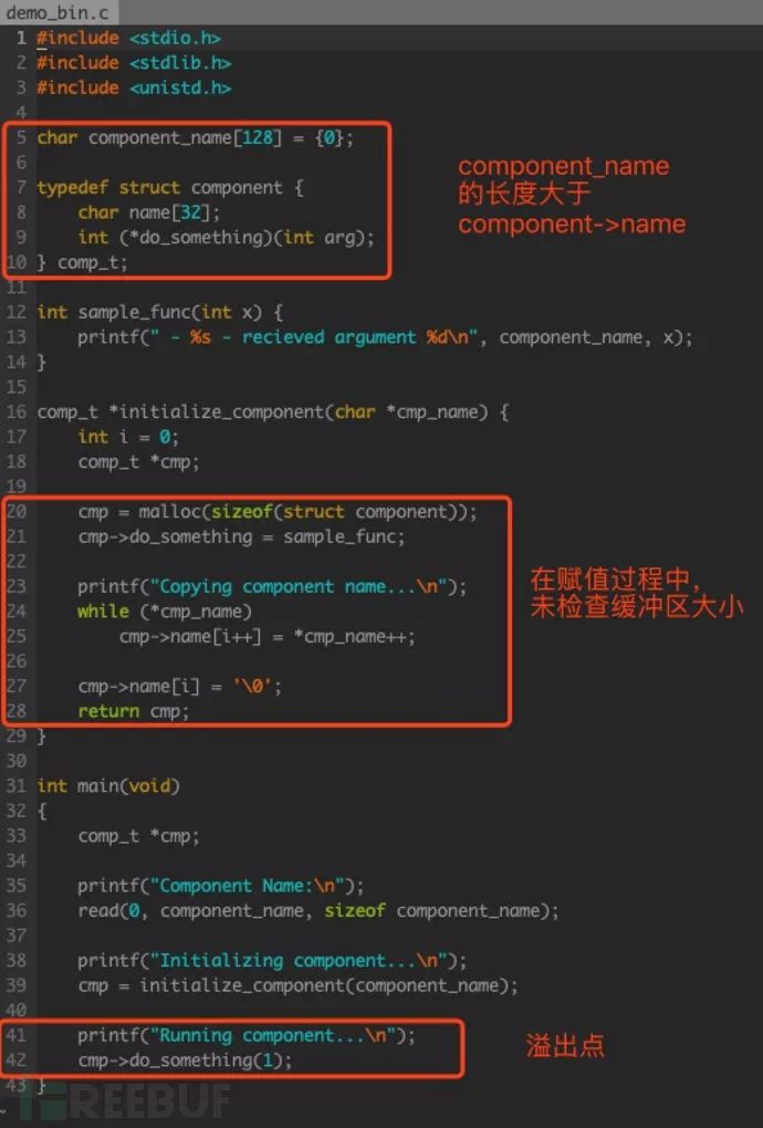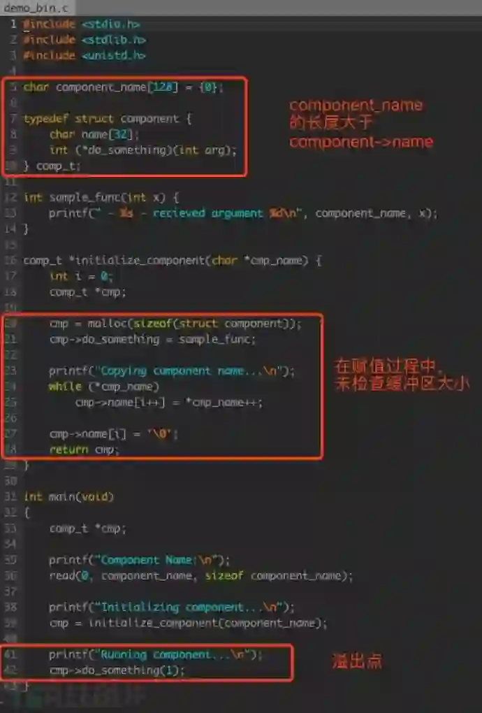 首先查看源码 demo_bin.c,存在一处堆溢出漏洞,关键点如下: