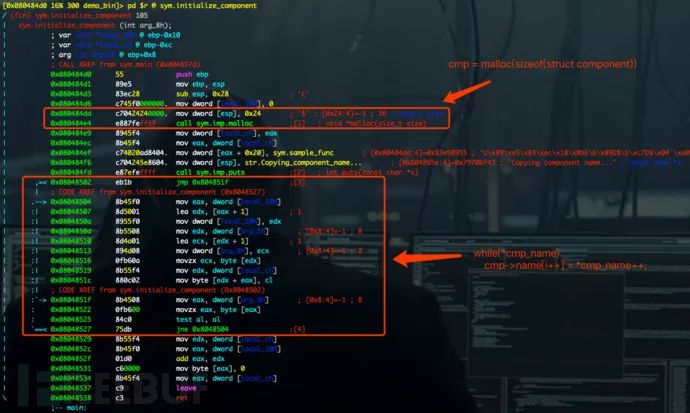 分析过程序源码后,利用 GDB 动态调试 demobin,以触发 Crash。首先通过 r2 查看 initializacomponent( char *cmp_naem) 所对应的汇编代码。