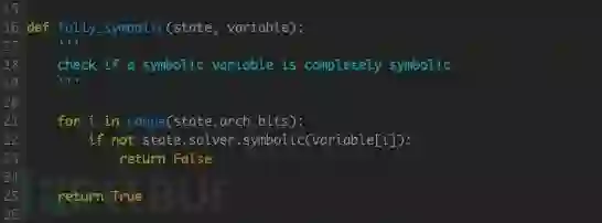 solve.py 中使用 fullysymbolic() 方法检查 EIP 中符号变量的数量。其中 state.arch.bits 代表系统字长(The number of bits in a word),state.solver.symbolic() 用以判断输入数据是否为符号变量,该方法在 ./angr/stateplugins/solver.py 中实现: