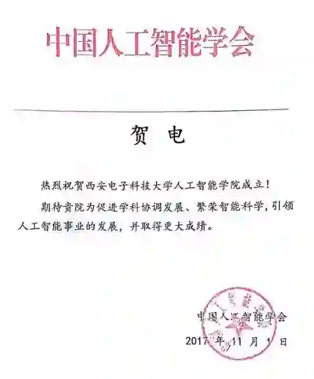 在经历了卅余载的沉淀,西安电子科技大学人工智能学院今日正式成立,中国人工智能学会向学院所在西安电子科技大学发来贺电。