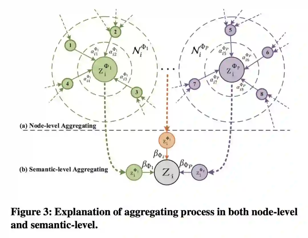 其中,是节点对 (i, j) 的注意力权重。注意这里的注意力是非对称的,这也符合图数据的实际特性。最后,通过节点级别的聚合操作(如图 3 (a) 所示)来学习 Semantic-specific 的节点表示。每个节点的表示都是由其邻居表示加权融合得到。