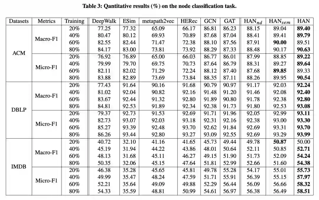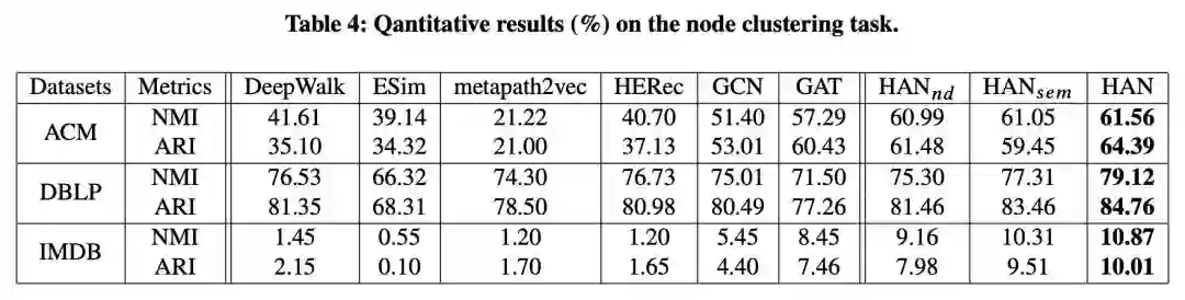 本文在三个数据集上做了大量充分的实验(包括节点分类,节点聚类,可视化)来验证模型的有效性。同时为了验证节点级别和语义级别的作用,作者分别去除节点和语义级别助理并进行实验。最后,作者通过对节点和语义级别的注意力机制进行了分析来说明 HAN 的可解释性。