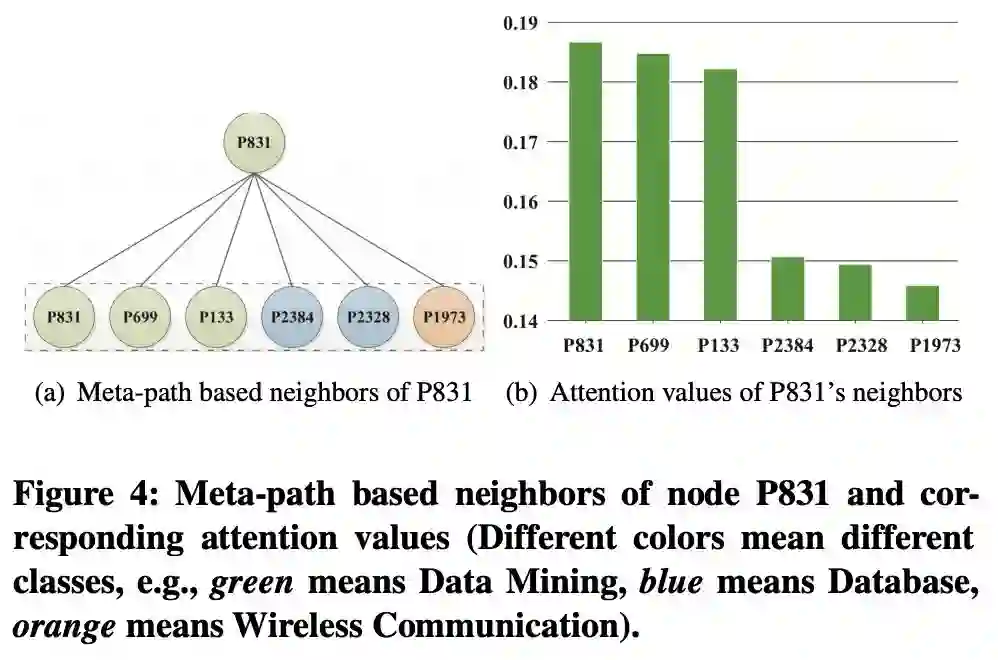 我们还进一步分析了层次注意力的合理性。节点级别和语义级别注意力分析分别如图 4 和图 5 所示。可以看出:节点级别注意力赋予了同类型的邻居更高的权重。在语义级别,对较为重要的元路径,也就是该条元路径在聚类任务上具有较大的 NMI 值,HAN 会赋予他们相应较大的权重,因此 HAN 可以自动选取较为重要的节点邻居及元路径。