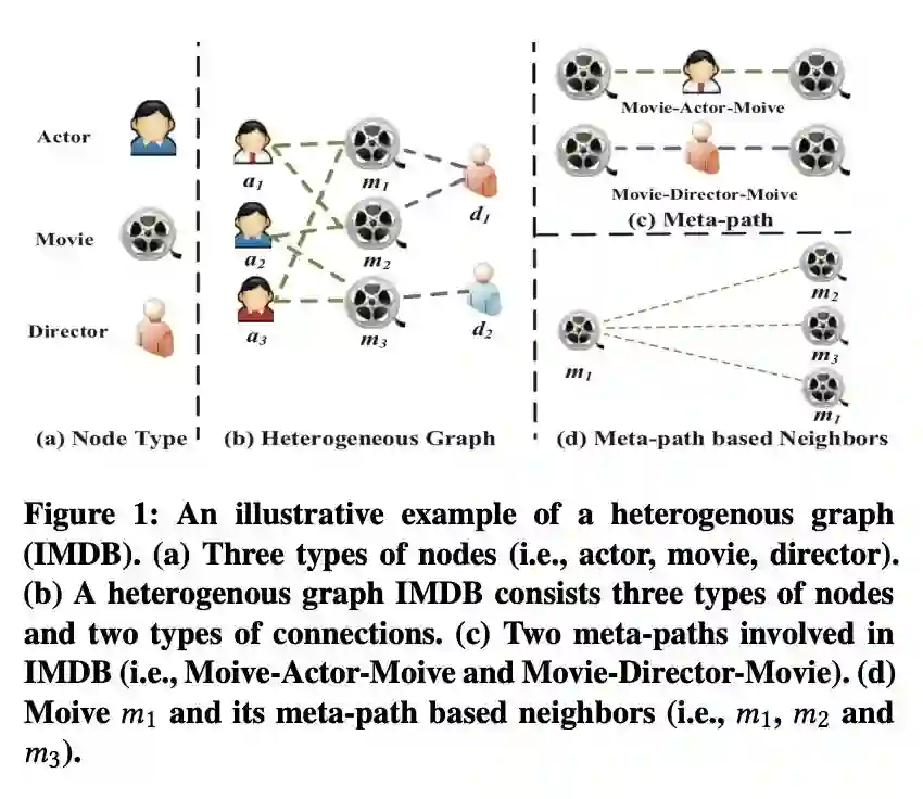 以 Graph Convolutional Network,Graph Attention Network 为代表的图神经网络已经引起了学术界与工业界的广泛关注。然而,目前的图神经网络主要针对同质图(节点类型和边类型单一)设计,但真实世界中的图大部分都可以被自然地建模为异质图(多种类型的节点和边,如图 1 所示,IMDB 数据中包含三种类型的节点 Actor、Movie 和 Director,两种类型的边 Actor-Movie 和 Movie-Director)。