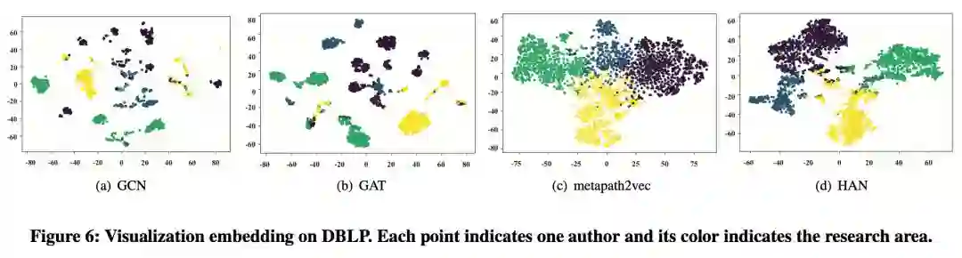 图 6 展示了各个算法可视化结果。我们可以清楚地看到:HAN 所学习到的节点表示具有更强的表示能力,可以清晰的将不同领域的作者分为 4 类。