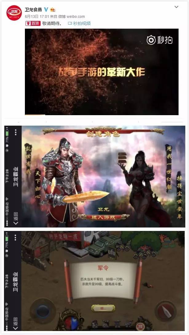 就在同一时间段,互联网知名辣条品牌卫龙在6月15日推出了第一款同名H5游戏——卫龙霸业。卖辣条的竟然去做游戏了!虽然最后实际的游戏成品比起热闹的宣传来说还是有一定的差距,但卫龙凭借这个H5游戏的噱头也赚足了品牌宣传的热点。